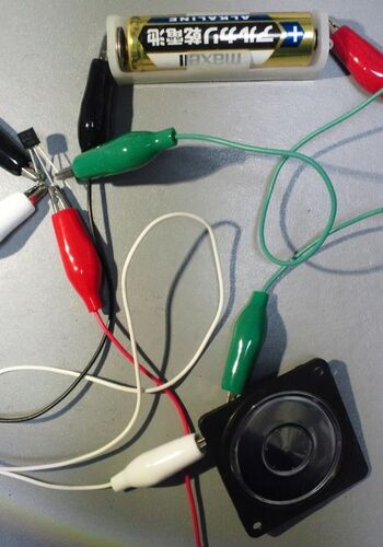 櫻井俊一著,たちもとみちこ作品デザイン『子どもと一緒に電子工作』(CQ出版)の「第5章 振動で発電する光るマラカス」という作品がある。 発音体のみの圧電サウンダ(圧電スピーカーともいう)に LED をつなぐだけという,極めてシンプルな構成である。 昔…